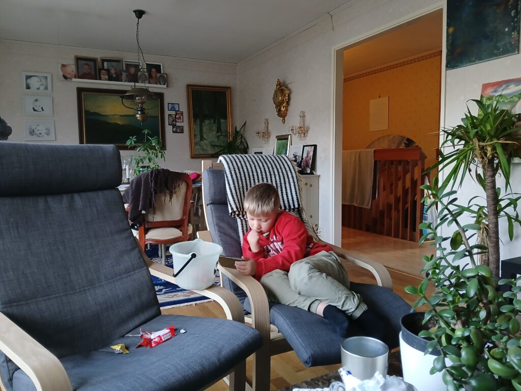 Idag har jag hämtat Alfred för att umgås med honom idag. Just nu sitter han och spelar på sin mobil. Han har sin Halloweenspan med godis i som han tar sig en mumsbit från ibland. Får man äta godis på morgonen? Ja jag tänker att man får det när frukosten är intagen och det är långt tills det är mat. Då hinner han bli hungrig tills maten.