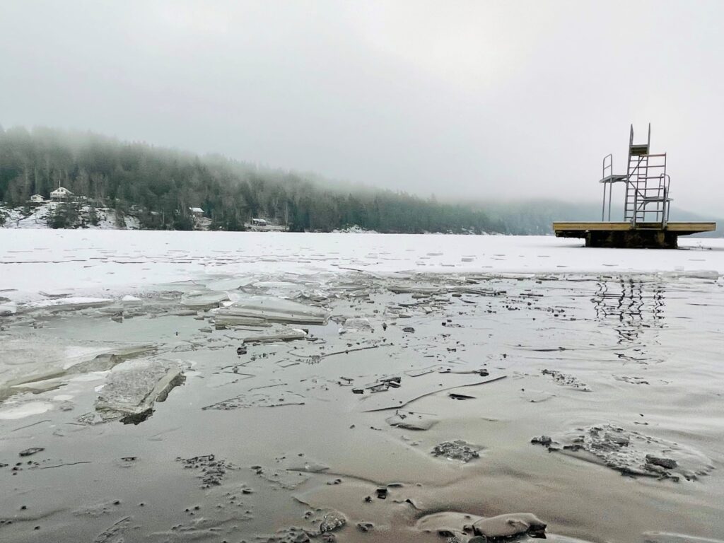 Idag fick vi återigen bryta is, idag var det spadat, stavar, och yxa som fick hjälpa till så det gick att gå i sjön. Någon cm tjock is, hade lagt sig på sjön. Medans jag gick där i vattnet och skyfflade bort isen, så kom en strof av en psalm. Bered den väg för herran eller är det herren. Det stod en badsyster uppe på land, väntade in rätta känslan, när jag skyfflade bort is så hon kunde gå i.