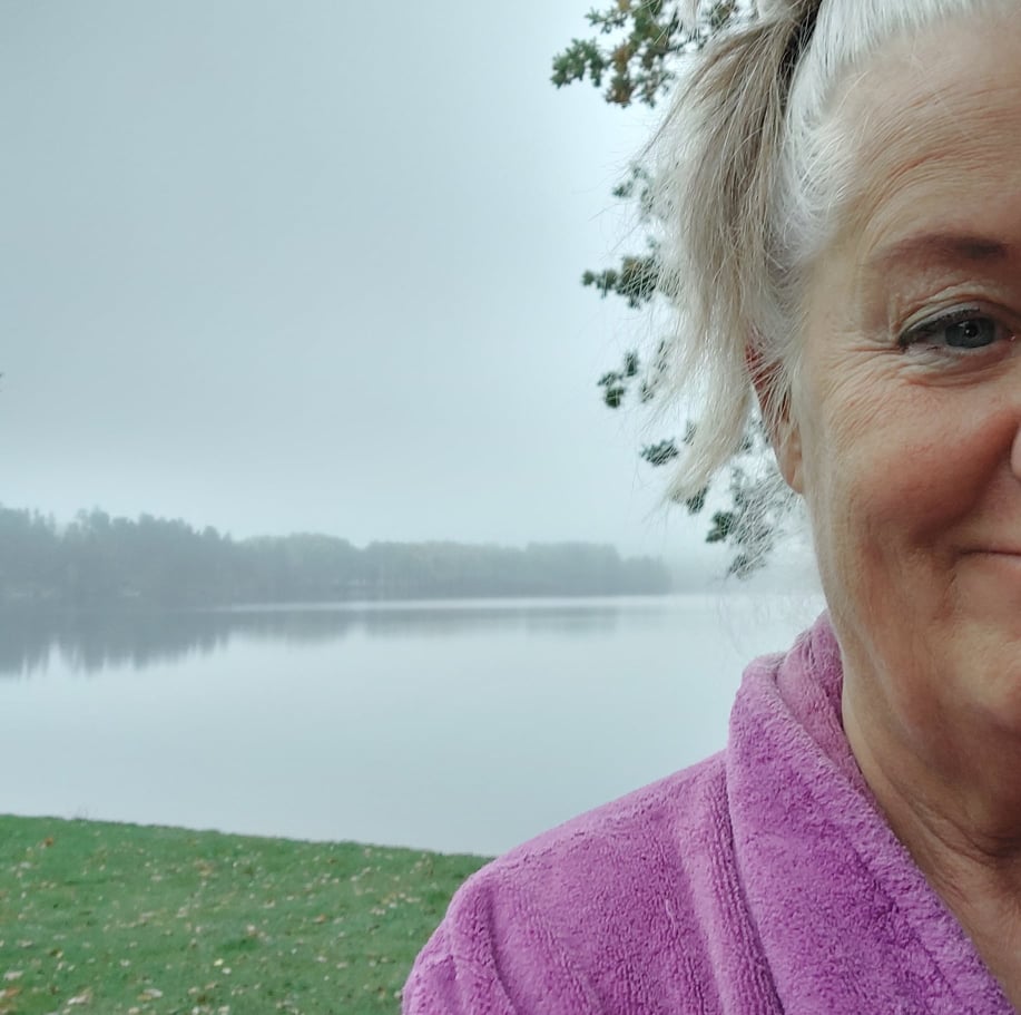 Idag gick jag upp en halvtimma tidigare, än jag behövde för att komma till jobbet. Sprang runt här i morgonrock och packade väskan för bad. Åt min gröt med äpple och kanel, utan mjölk. Det passar perfekt för poängen i WW. Innan halv åtta gav jag mig iväg till sjön. Var där tio i åtta. Packade upp mina kläder, la dom i ordningen som jag skulle ta på dom. Gick ner till sjön och badade. Idag blev det som de andra kvinnorna utan kläder på. Förutom mina badskor och handskar. Simmade några få simtag, låg i sjön och njöt i kanske tio minuter. Sedan snabbt på med kläder och iväg till jobbet. En lång dag där det var mötes dag.