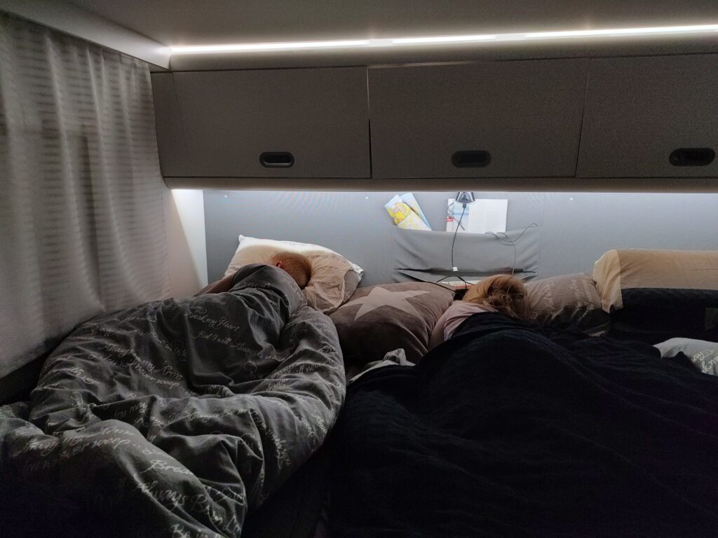 Just nu regnar det. Smattret är en mysfaktor när jag sitter här och skriver. Regn när man sitter inne i husbilen är ett trevligt tillägg. Ett avkopplande ljud som ger en känsla lugn och ro. Vi får hoppas det slutar när vi ska göra parken. För säkerhets skull tar vi med paraplyer. Vi har två med oss.