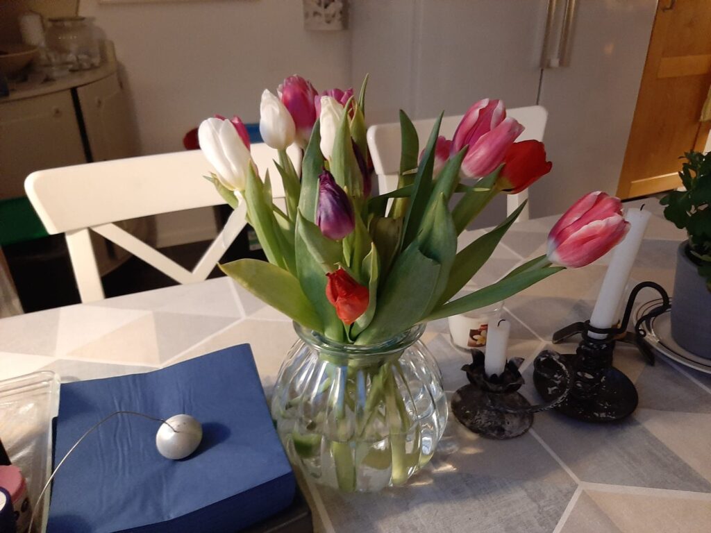 När jag kom hem på fredag morgon så ställde jag tulpanerna jag fått av mina arbetskamrater på köksbordet. Av maken fick jag också tulpaner, vilka fick bo på farmors matsalsbord i vardagsrummet.