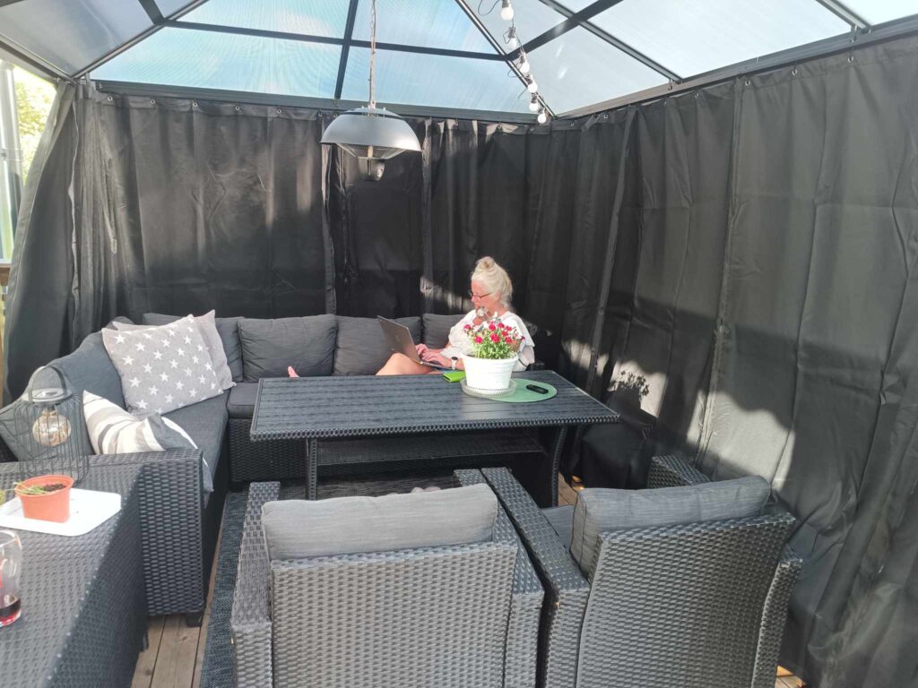 I sommar har jag verkligen fått upp ögonen för sömnad. Jag som trodde att jag inte kunde sy har under sommaren sytt ny klädsel till vår husbil. Därför känns det inte så svårt att sy nya kuddfodral till prydnadskuddarna under paviljongen. Att återbruka, även om det bara är dragkedjorna, ger mig en känsla av tillfredsställelse och bidrar till att minska avfallet.