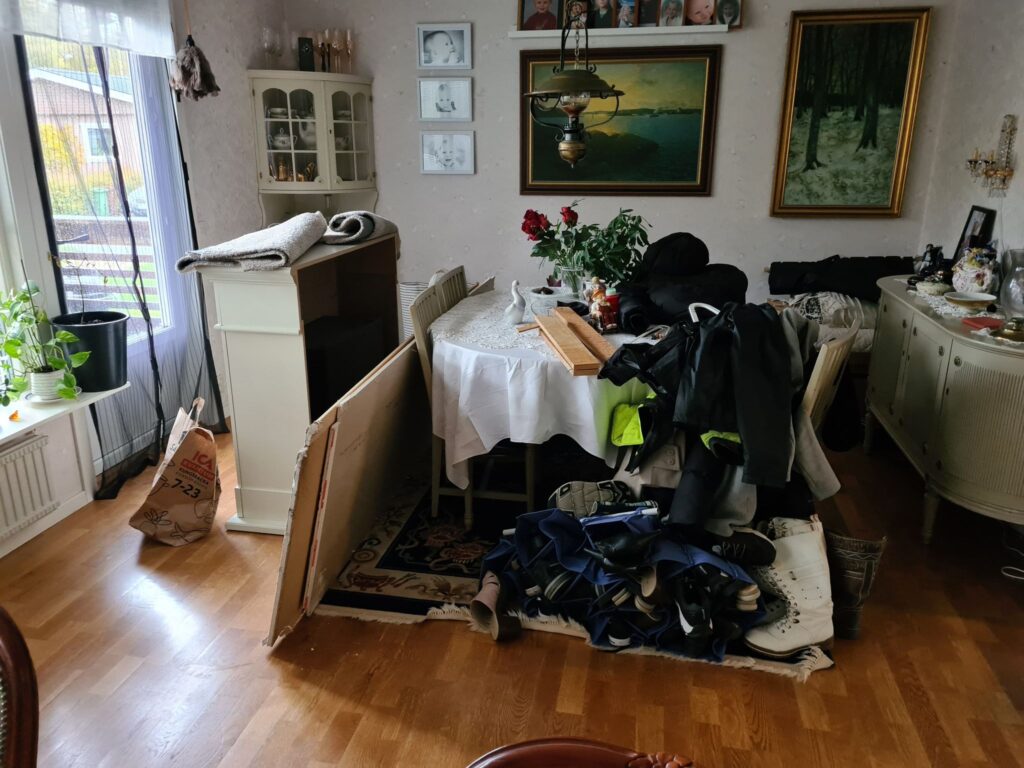 Vardagsrummet uppe, är kaos ännu. Till och med mera kaos, än innan. Tänker att jag får förklara att det brukar inte se ut så här. Men just nu väntar vi på besiktningsmannen och när han kommit. Då blir det ordning på garderoben i hallen och allt kommer att försvinna. Vad ska dom tänka. Nåja jag bryr mig inte så mycket, om deras tankar om stöket. Skulle dom ha tankar om det, säger det mera om dom, än om mig.
