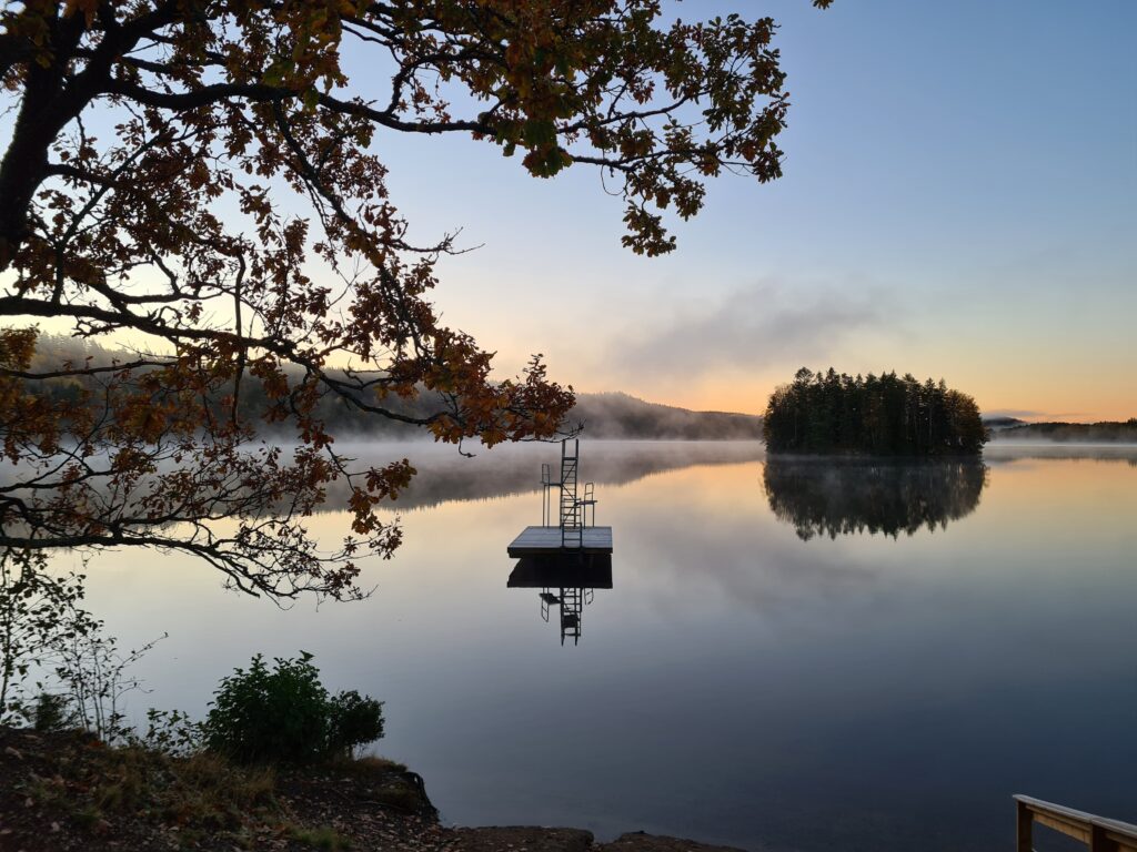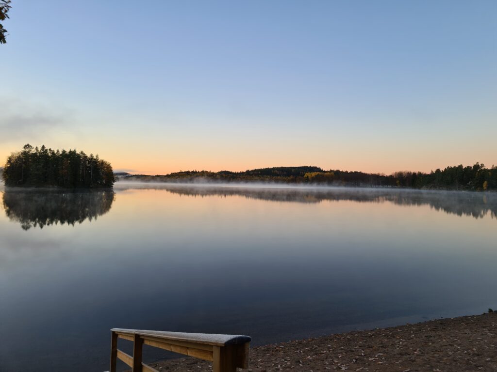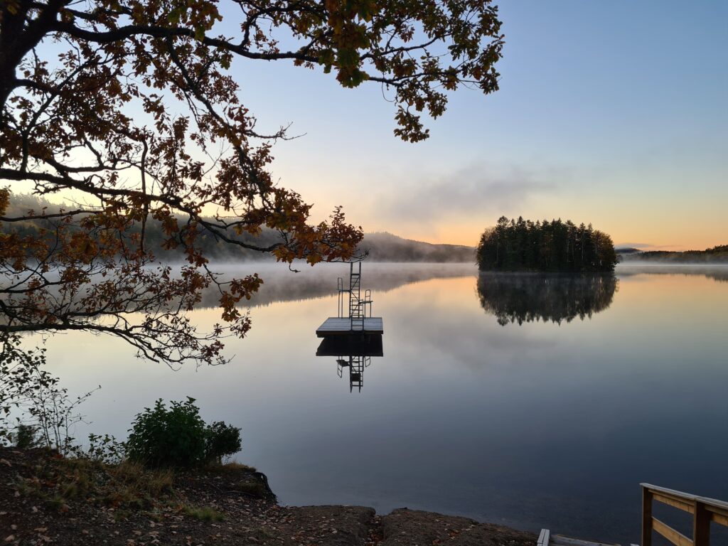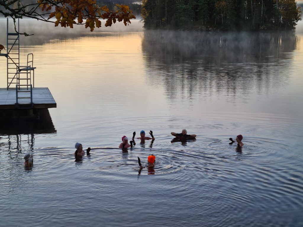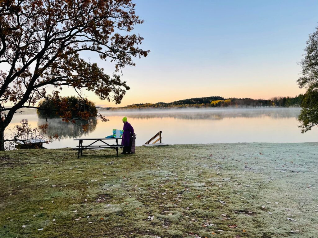 Det gjorde nästan ont i kroppen att gå ner i vattnet idag. Men när jag väl var i kändes kylan behaglig. Underbart vackert att stå där i sjön, och titta på allt det vackra denna fina morgon. Allt blir så stilla i kroppen när jag står där i vattnet. Hela jag fylls av lugn, kroppen saktar ner tillsammans med tankarna. När jag gick upp ur vattnet flyttade värmen in i kroppen. Men händerna frös, kylan bet sig fast i fingrarna. Nu är det dags att ha vantar på när jag åker till sjön, på med vanterna när badet är klart, då badvantarna åker av. Badade i tre minuter idag det fick räcka. Kylan blir inte så påtaglig under dagen när baden är kortare.