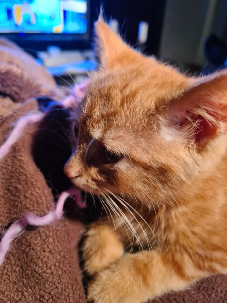 Katti-fnatten har katt ryck hela dagarna och han gillar inte när man kollar sin mobil. Då vill han krypa upp i knät så att man slutar. När man inte har mobilen ligger han bredvid. Han är en konstig katt. När jag stickar vill han gärna hjälpa till. Det blir lite svårt att sticka då.
