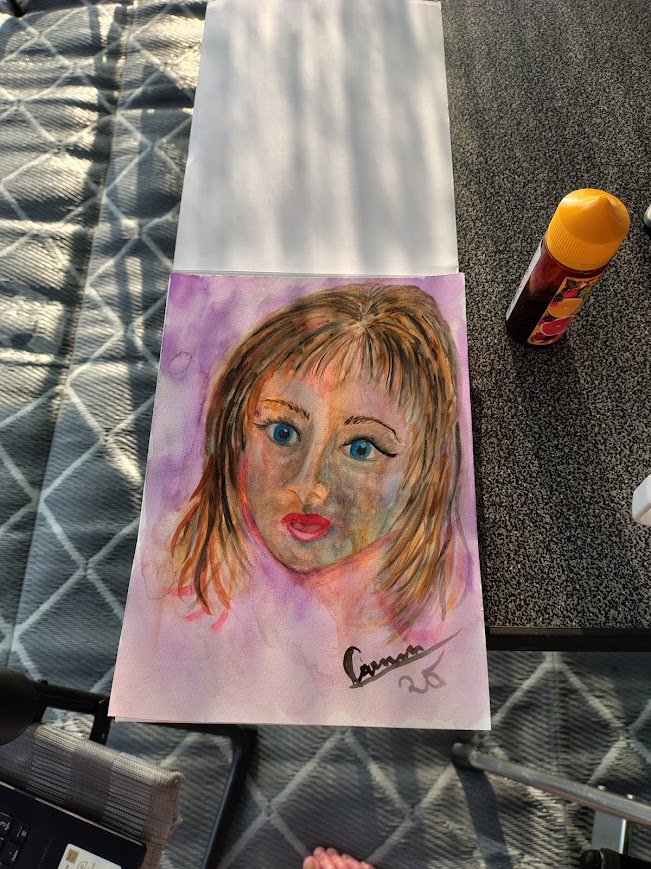 But I painted anyway. A girl’s face, drawn freehand. The eyes turned out too big – almost cartoonish – but still, there was something there. A glow, a kind of motion. It wasn’t detailed, but it had feeling. And sometimes that’s enough. When you’re new at something, it doesn’t have to be perfect. It can look childlike. What matters is that I dared to try. Watercolors feel risky to me, almost threatening in the way they settle and stay – no second chances.