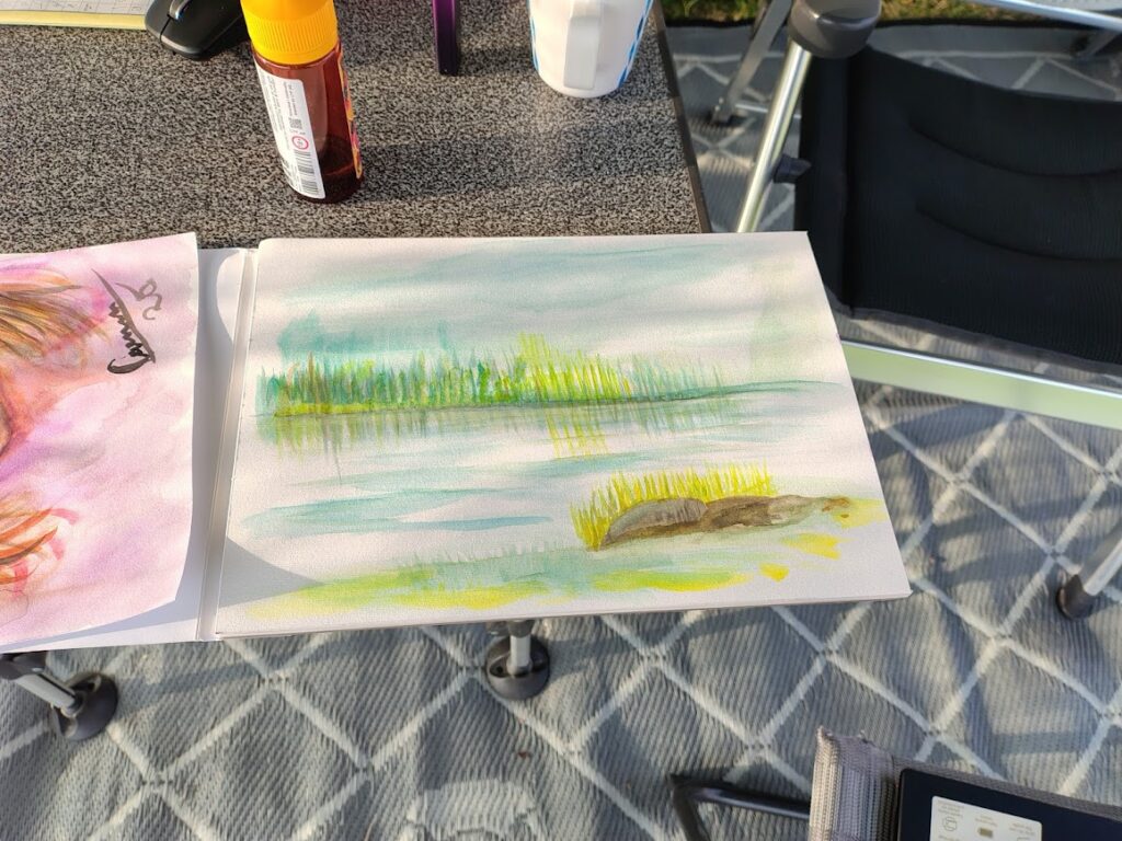 I also painted a landscape, and there it was even clearer that this wasn’t my strength. Watercolor requires discipline. It doesn’t forgive. It stays where you put it, whether gentle or unforgiving.