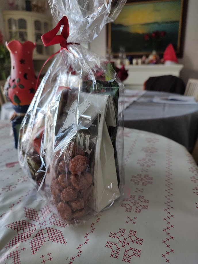 Igår va det en fin liten påse i brevlådan från en Kals kaffe butik. Där fanns massor av goda julgodisar och lite kaffe med smak av karamell och salt. Ingen lapp till vem den är till eller vem som lämnat. Jag har en vän som ibland kommer förbi med lite gåvor. Jag tänkte genast att den var från henne. Samtidigt som jag tänkte konstigt, hon brukar ju skriva något eller lämna över personligt. Men inget fanns det att hitta var ifrån den kom.