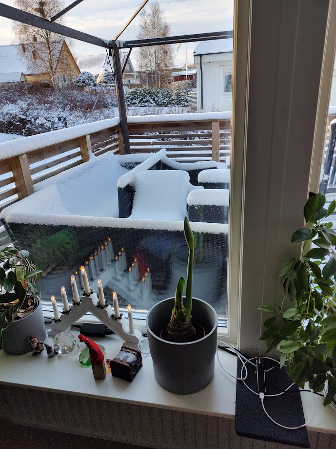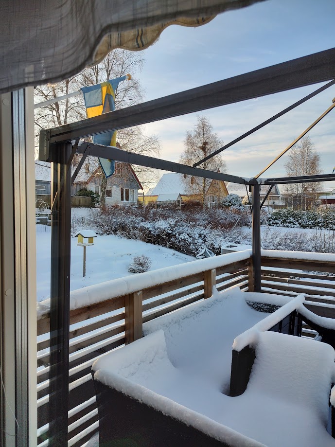 Här ligger snön vit och vacker. Det har snöat mycket vill jag lova. Maken fick lägga över en timma på att skotta fram uppfarten. Det blir alltså snö till julen. Nu ska vi bara bli pigga och friska. Där är vi inte ännu. Utan här är det snorigt ännu. Trött till och med lite andfådd när jag rör mig. Men det är fortfarande en dag kvar. Vi får se om vi orkar med besök eller om det får vänta till mellandagarna.