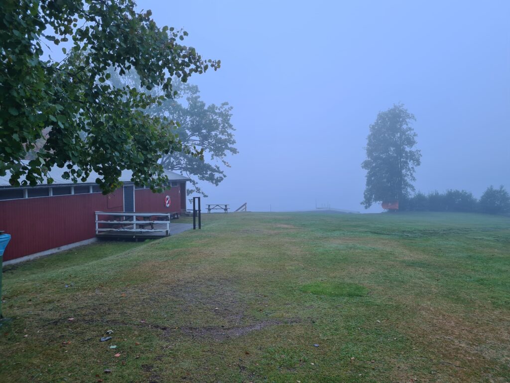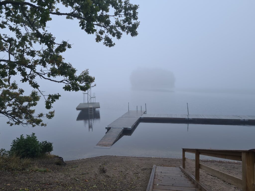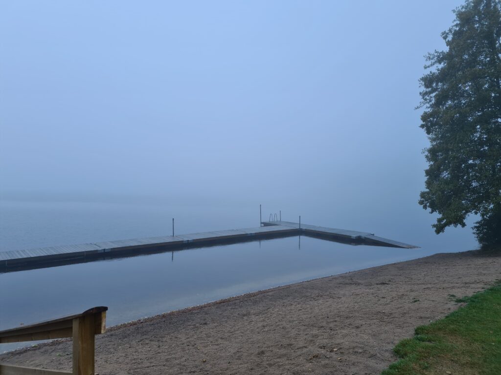 Det skulle kunna vara en titel på en film eller bok. Men just i det här inlägget är det bara en enkel skorstensman. Idag för en stund sedan, blev det bad i 14,1 gradigt vatten. Simmade 200 meter i dimma. Idag var vi bara 4 bastystrar som badade. Vattnet kändes kallt till en början men när kroppen vant sig, vart det skönt att simma dom där metrarna. Den täta dimman kändes som den var tagen ur en film. Man skulle kunna förvänta sig att vad som helst hade kunnat komma fram ur dimman. Nästan lite skrämmande, om man tittat på många hemska filmer, vilket jag inte gör sedan min tonårstid. Förutom några få gånger som jag trott mig, klara sådant.
