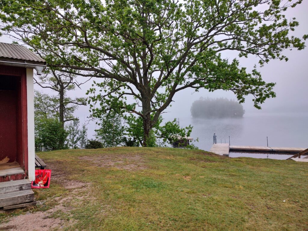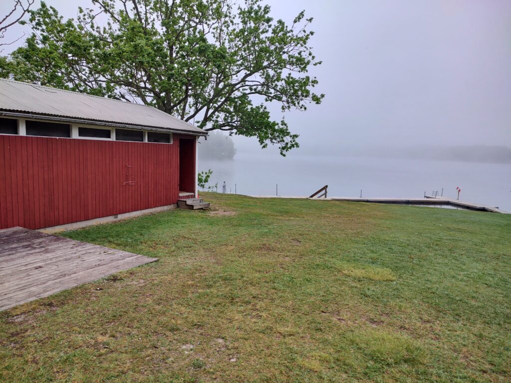 En tidig morgon ännu en gång. Den här morgonen var grå och mulen, med dimman som ett täcke över sjön när jag kom fram. En av mina badsystrar var redan där och helt försjunken i att fotografera. Jag insåg då att jag hade glömt badhandduken hemma när jag klev ur bilen. Jag tyckte att väskan kändes lite lätt redan hemma, men kom inte på att handduken saknades. Men vad spelar det för roll när jag har förmånen att uppleva en morgon vid sjön? Ingenting alls om du frågar mig. Jag hade ju badkappan på mig, och den fungerar också att torka sig med.