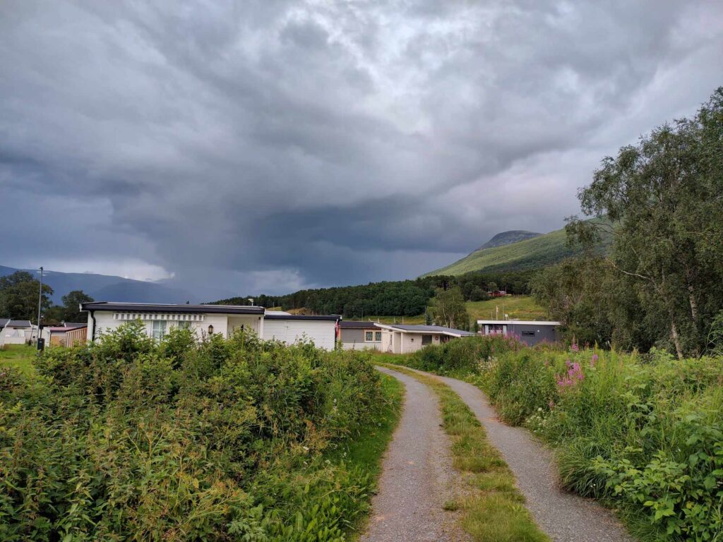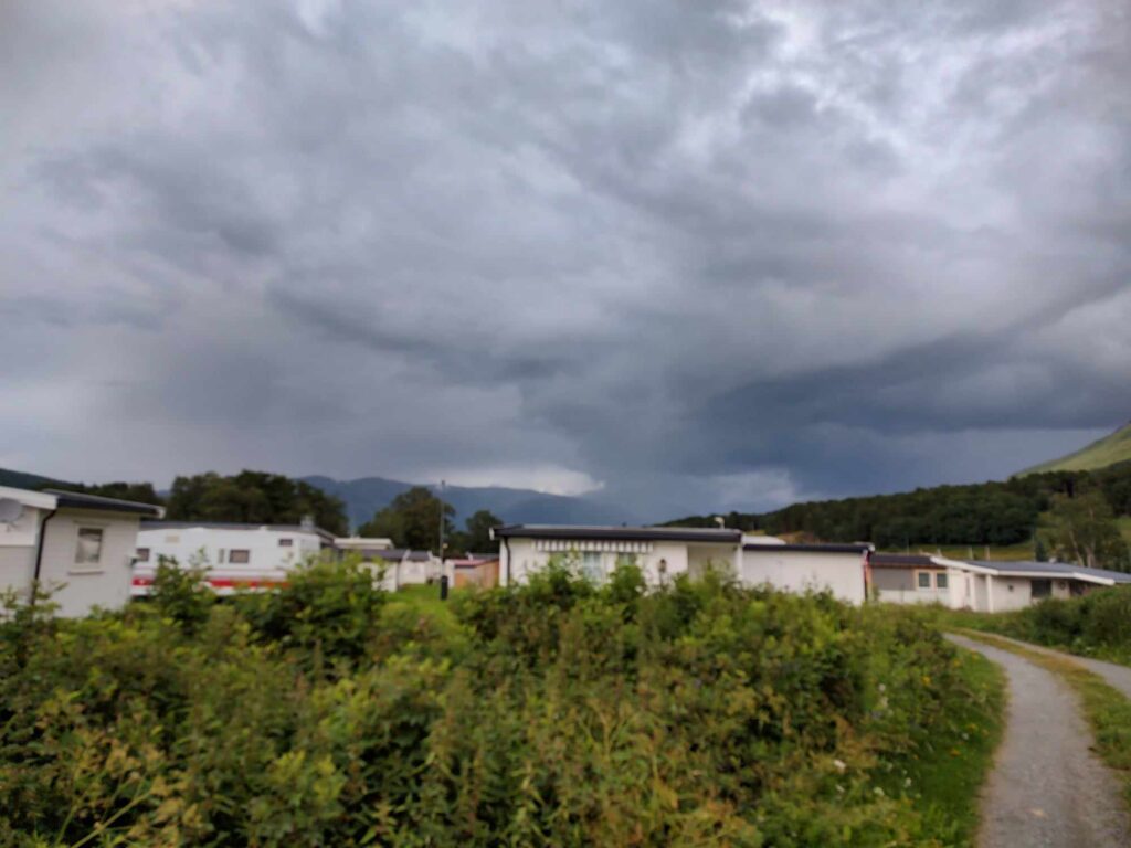 Vädret ändras fort uppe på fjällen, mörka moln ligger tät ihop för att bara efter en kort stund bli något annat. Riktig dramatik i dess skådespel. Det är så obeskrivligt vackert här bland alla höga fjäll. Här finns en stor skidbacke, tänker att det är många som kommer hit om vintern.