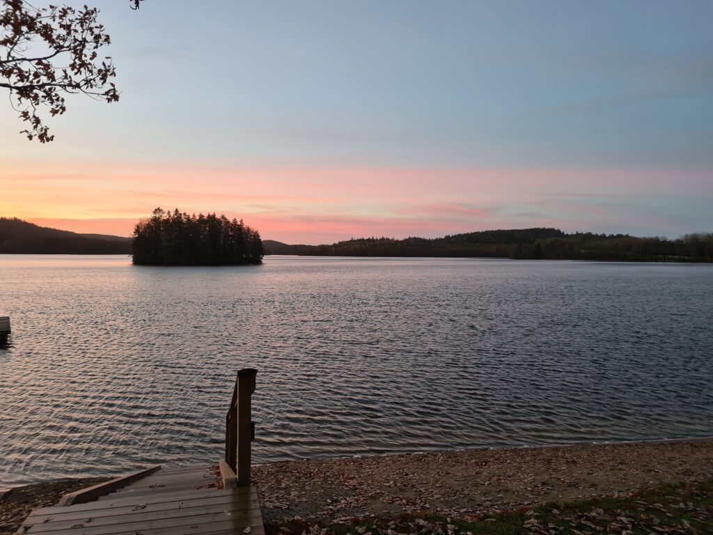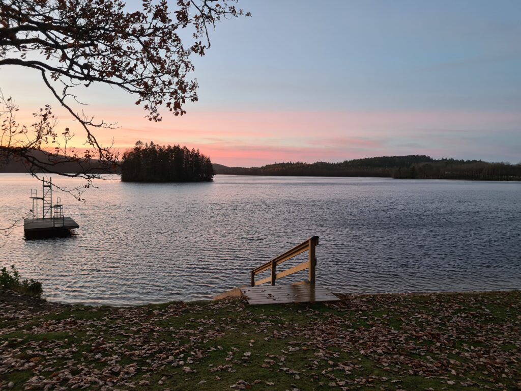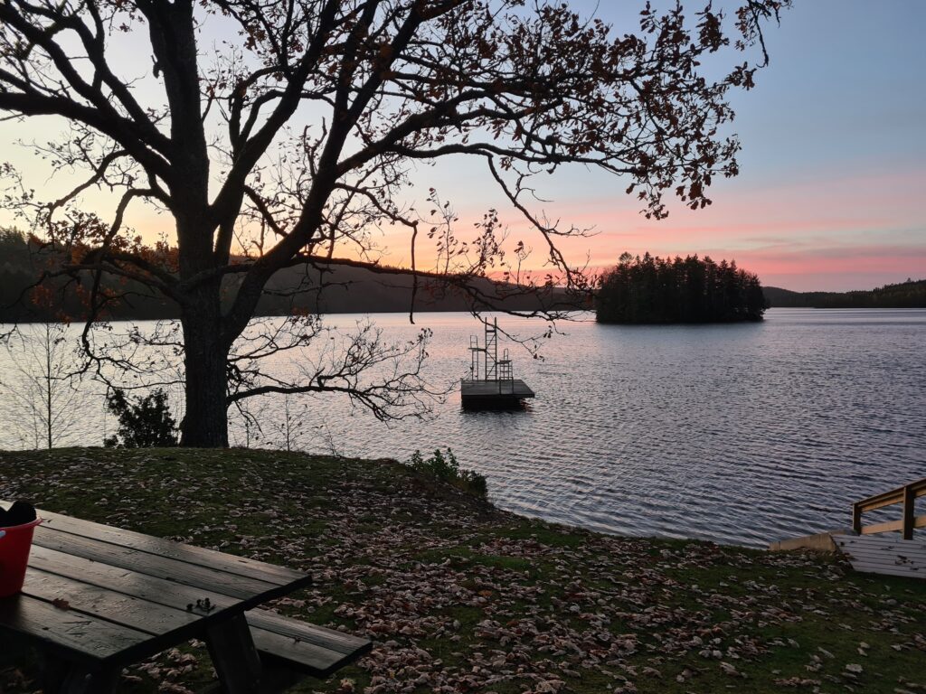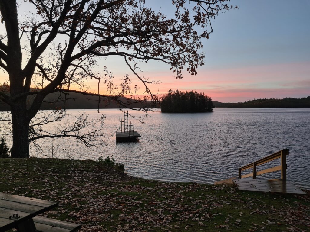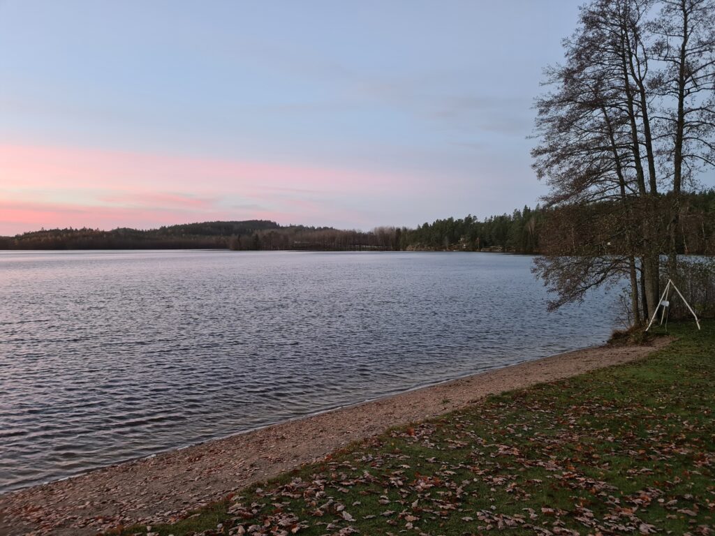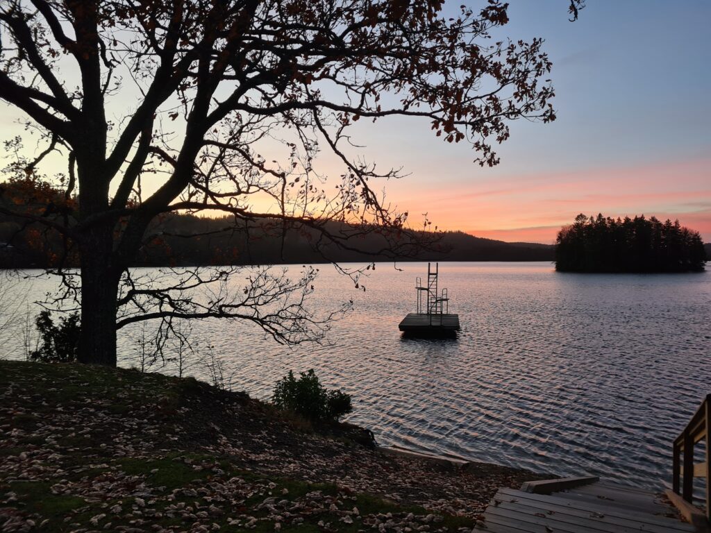 Vilken morgon. Halleluja vilken fantastiskt fin morgon det var idag. Hade tänkt stanna hemma från badet idag. Men halv åtta kom jag på att det är dom dagarna som jag tänker stanna hemma, det är då jag ska åka iväg. Det är dom som är mest uppskattade, när jag åker därifrån. Sååå vackert där borta. Himlen i ett rosa skimmer, det nu nästan nakna träden, avskalade från sommaren för att möta den stundande vintern. Den där vintern där kylan ska omhulda oss, där vintern ska få våra små fingrar och tår att kännas som isbitar när vi byter om det bad. Den är snart här. När kommer isen tro. Ännu är det svårt att föreställa sig de där isblocken som vi bröt förra vintern för att få bad. Svårt att se mig själv stå där i sjön och bryta is helt naken med bara vantarna på. Men jag har upplevt det och det kommer igen upplevas. Halleluja vilken morgon, nästan så att man går och blir religiös. Jag som bara går till kyrkan på julafton. Tack universum för denna fantastiska stund nu på morgonen.