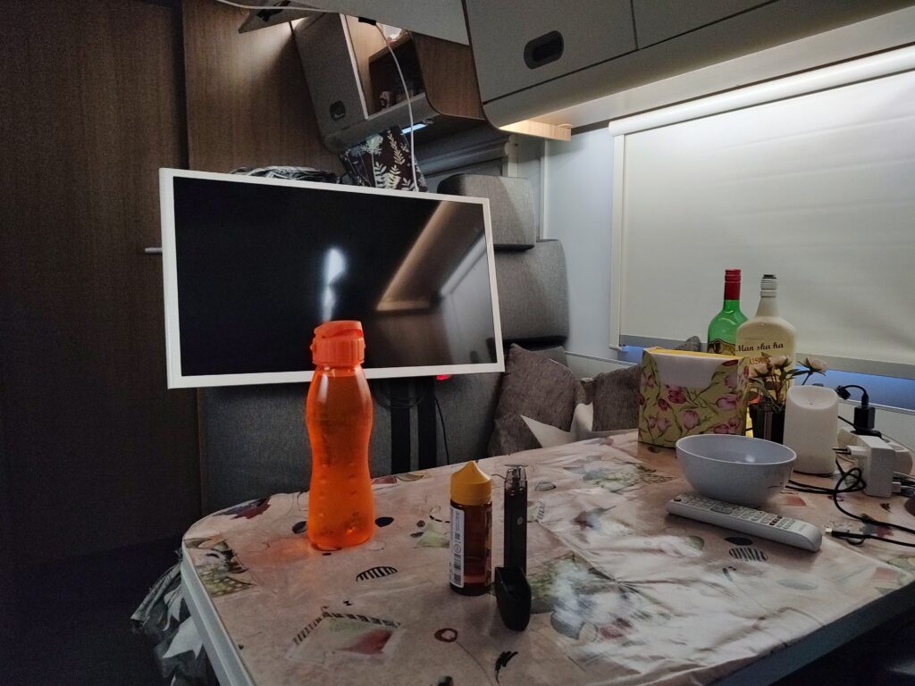 Vi kom hit igår, en timma innan jag skulle till massagen. Till en början fungerade inte elen. Den startades och slogs av, ute på stolpen. Maken började fundera på vad som kan vara fel. Senare märkte maken att vår granne, hade liknande problem. Det gjorde slutsatsen att det inte var fel på bilen, utan för lite ström i stolpen. Grannbilen fick sluta ha golvvärme vi fick köra värme med gasolen. Då fungerade elen så att vi kunde se på den stora tvn, ladda sådant vi behövde. Den stora tv som vi har framme i sittgruppen, går inte på 12 volt. Bara vår lilla tv har 12 volt.